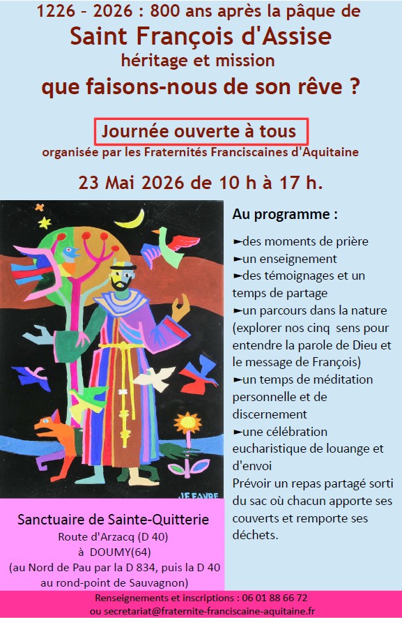 1226 – 2026 800 ans après la Pâque de Saint François d’Assise.Héritage et mission Que faisons-nous de son rêve ? Journée ouverte à tous organisée par les Fraternités Franciscaines d’Aquitaine Catégories : Régional