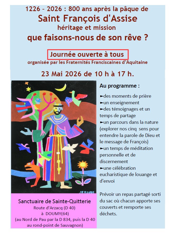 1226 – 2026 800 ans après la Pâque de Saint François d’Assise.Héritage et mission Que faisons-nous de son rêve ? Journée ouverte à tous organisée par les Fraternités Franciscaines d’Aquitaine Catégories : Régional